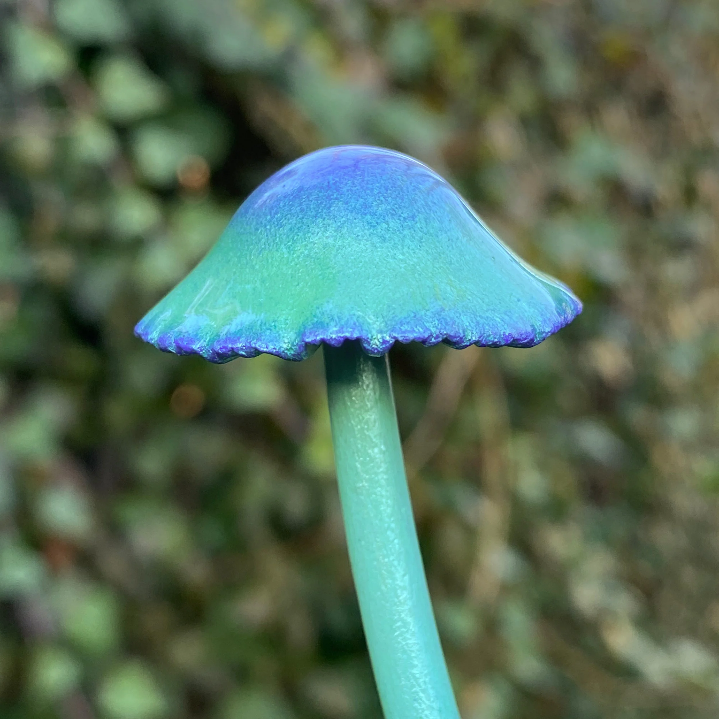 This enchanting mushroom is handcrafted with apoxie clay, acrylic paints, and resin. In the light it shimmers with a greenish iridescence. Stake it into a potted plant or display it as decoration to add some extra whimsy and magic to your space.